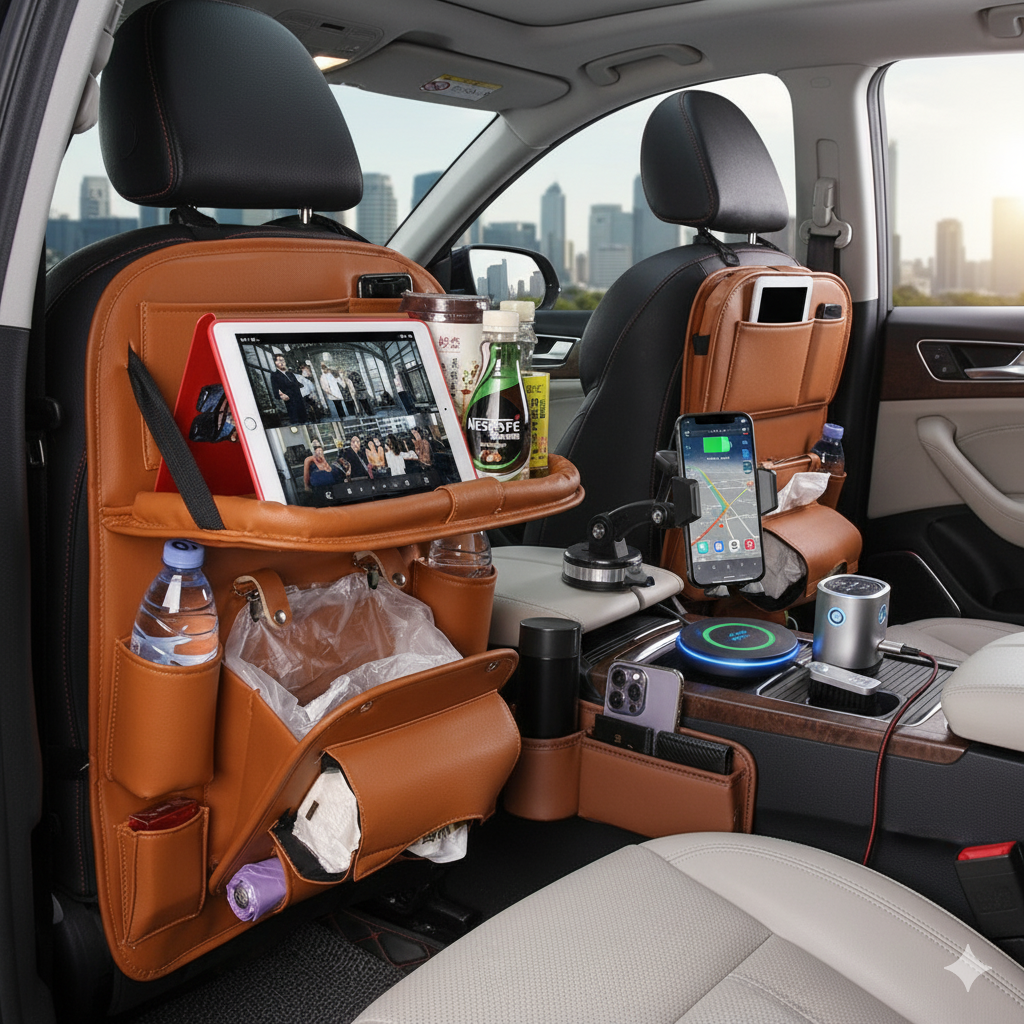 PU Leather Car Seat Back Organizer – Waterproof Hanging Storage Bag with Foldable Tray